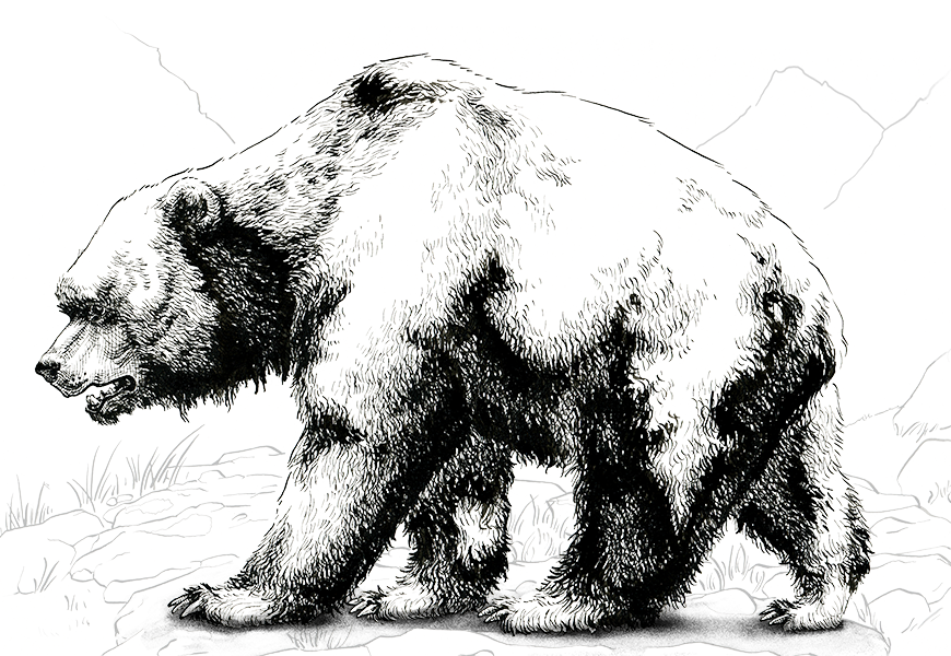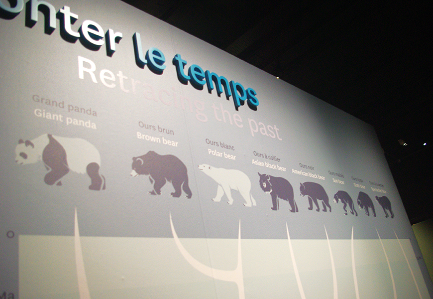 Pour l'exposition "Espèces d'ours" (Muséum national d'Histoire naturelle octobre 2016) J'ai été amenée à réaliser en collaboration avec le service des exposition du MNHN plusieurs éléments : - des pictogrammes des sept espèces d'ours ainsi que d'autre espèces cousines utilisés à plusieurs endroit de l'exposition, - des anatomies comparées de crânes et de pattes inférieures - des illustrations simplifiées des sept espèces d'ours pour un jeu de palets - des reconstitutions d'ancêtres préhistoriques des ours insérés par la suite dans un module interactif (réalisation du module par l'agence Fleur de Papier - animation d'un rythme cardiaque d'ours en activité et en hibernation - illustrations d'un ours Brun en hibernation dans sa tanière - réalisation d'une grande fresque d'infographies concernant l'ours des Pyrénées - un film d'animation retraçant l'histoire des ancêtres des ours et la répartitions des différentes espèces sur le globe